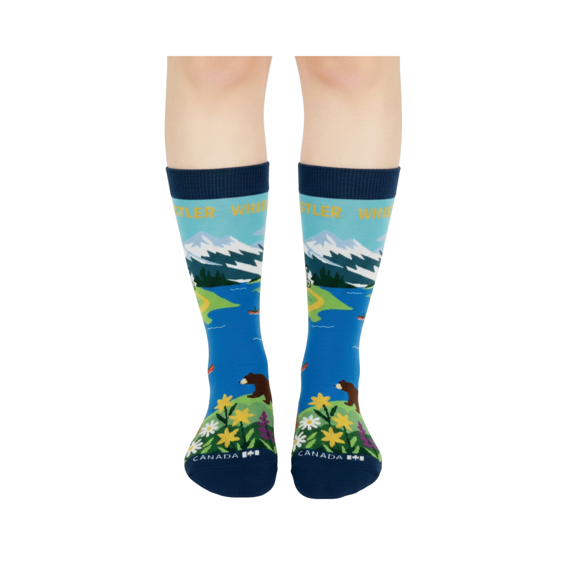 Celebrate alpine scenery and outdoor spirit with these Whistler Scenic Mountain Crew Socks. Inspired by Whistler’s mountain landscapes and lake surroundings, the design brings together snow-capped peaks, calm blue water, forested hills, and wildlife details in a clean and playful illustrated style. The composition reflects the balance between adventure and tranquility that defines mountain destinations.