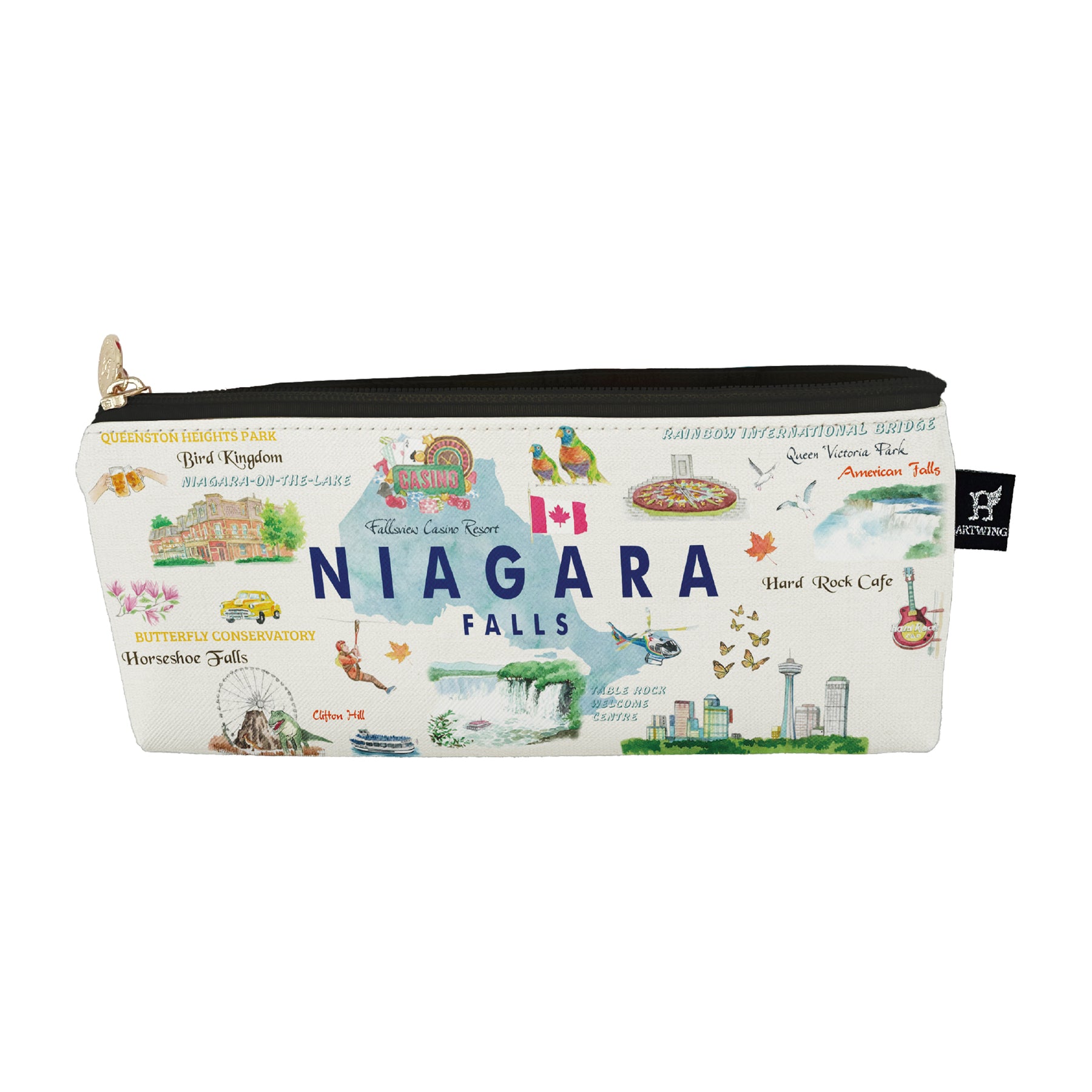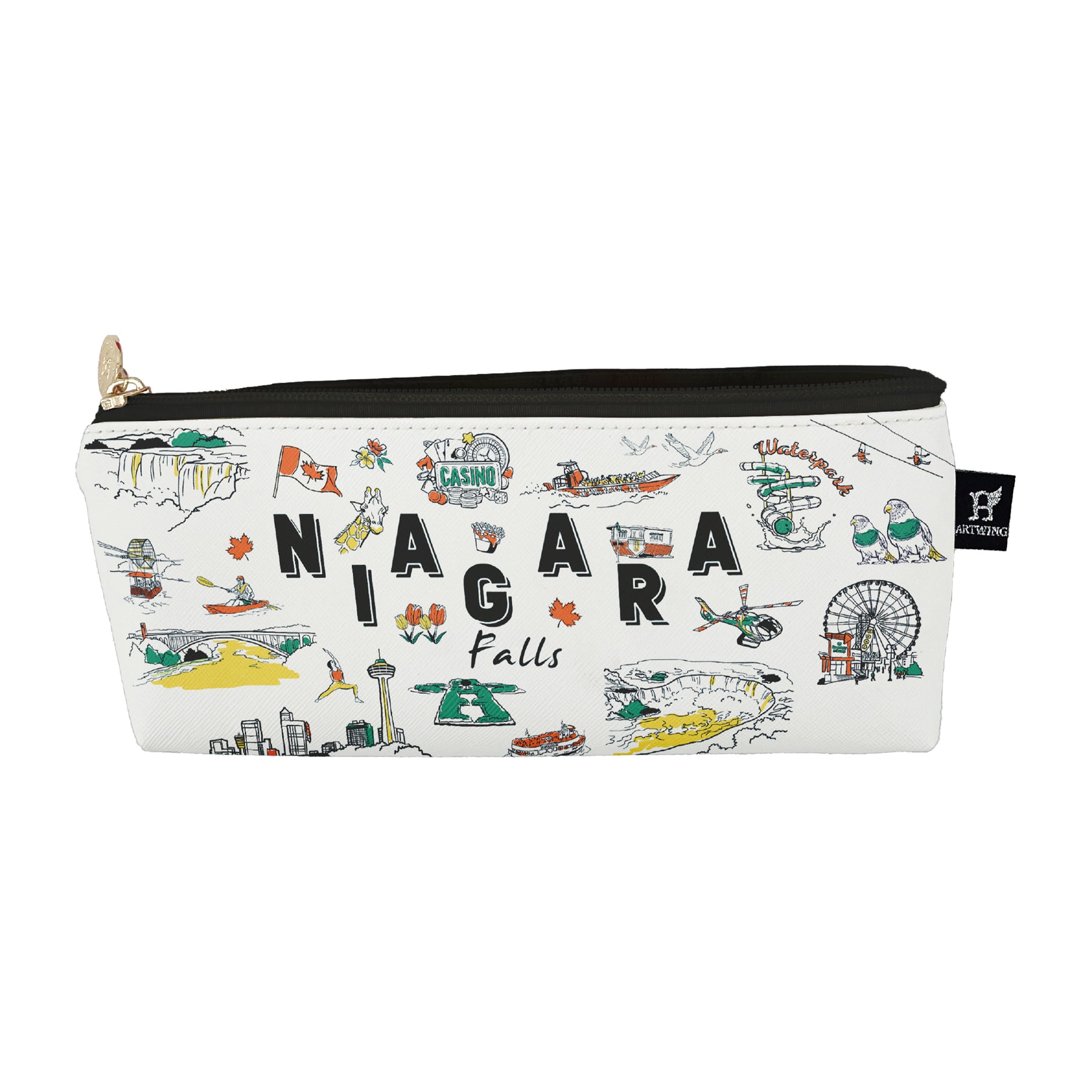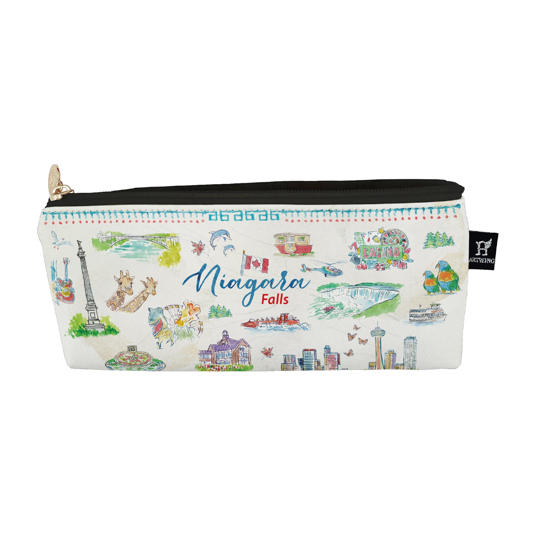This long pencil case features a bold illustrated layout showcasing Niagara’s landmarks, wildlife, and signature attractions. The energetic sketch style and lively colors create a fun, travel-inspired look that brings personality to both school and work organization.