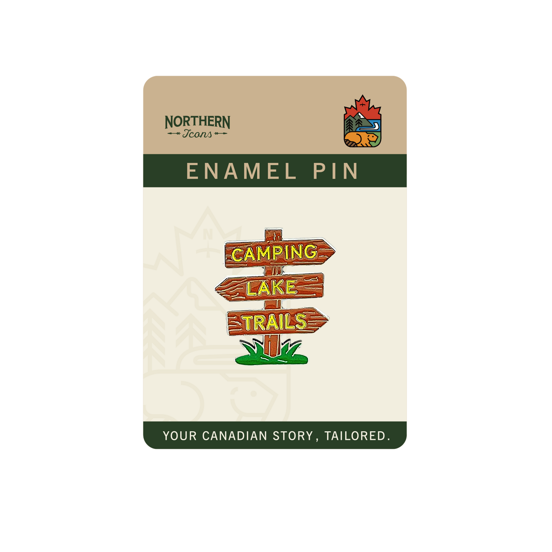 Inspired by rustic wooden trail signs, this enamel pin points the way to “Camping,” “Lake,” and “Trails.” With its clean lines and earthy colors, it captures the spirit of outdoor adventure, freedom, and a love for nature. A charming tribute to the joy of exploration.
