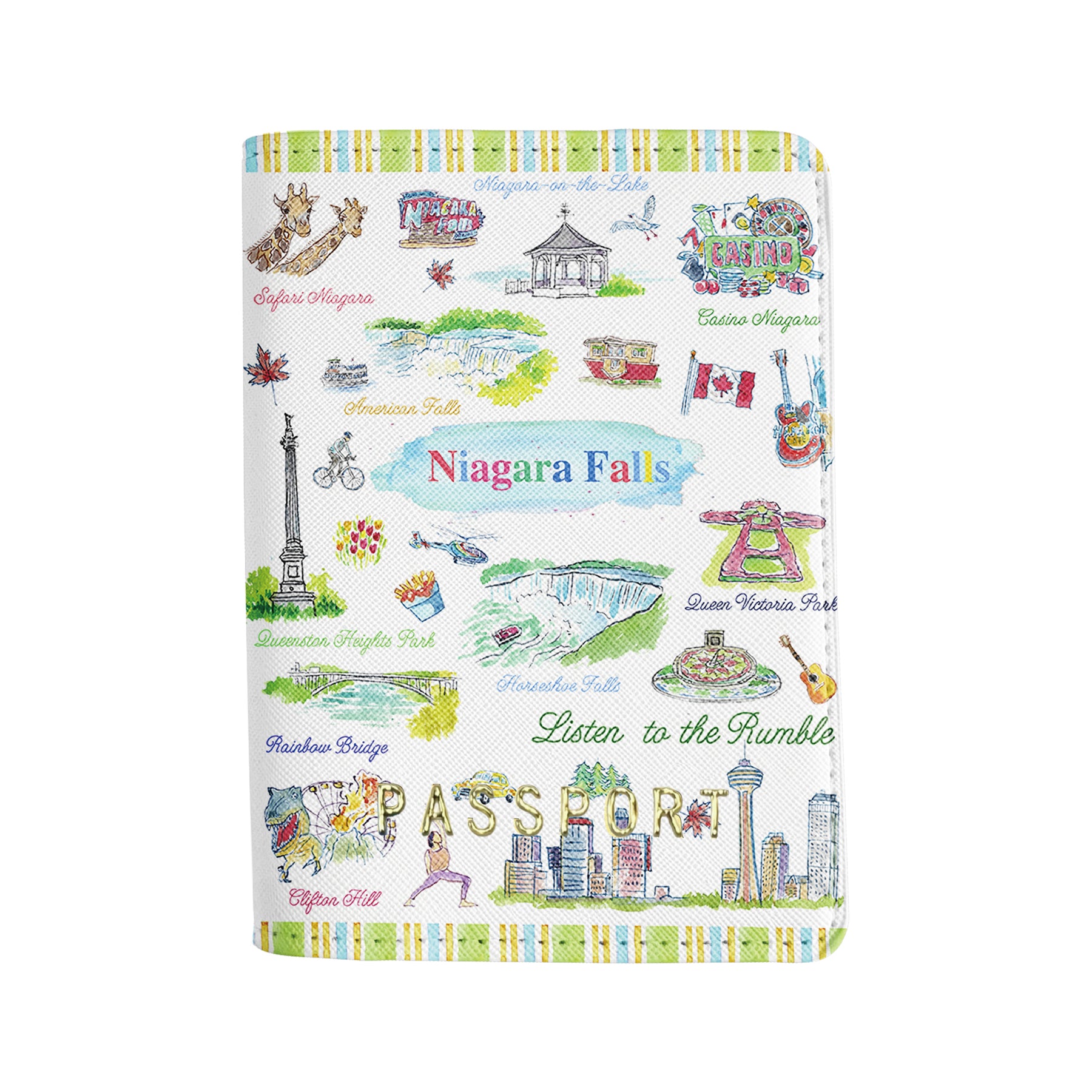 Bring the charm of Niagara Falls into every journey. This illustrated passport cover features a joyful mix of hand-drawn landmarks such as Horseshoe Falls, Rainbow Bridge, Skylon Tower, Clifton Hill, and local icons that celebrate the energy and color of this beloved destination. The bright watercolor style adds a cheerful touch, turning a travel essential into a mini keepsake of Canada’s natural wonder.