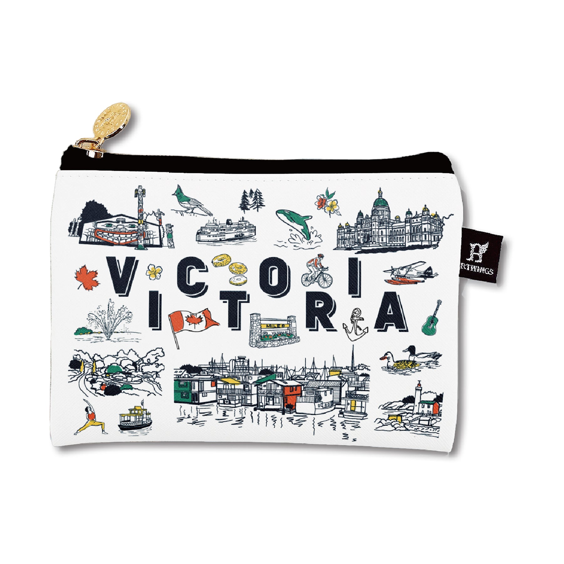 This illustrated small pouch bag highlights the charm of Victoria through playful hand-drawn artwork featuring local landmarks, coastal wildlife, floral accents, and cultural symbols. The design includes iconic elements such as Parliament Buildings, Fisherman’s Wharf, waterfront scenes, seaplanes, totem poles, and maple leaves—arranged around bold “Victoria – British Columbia” lettering for a modern and cheerful look.