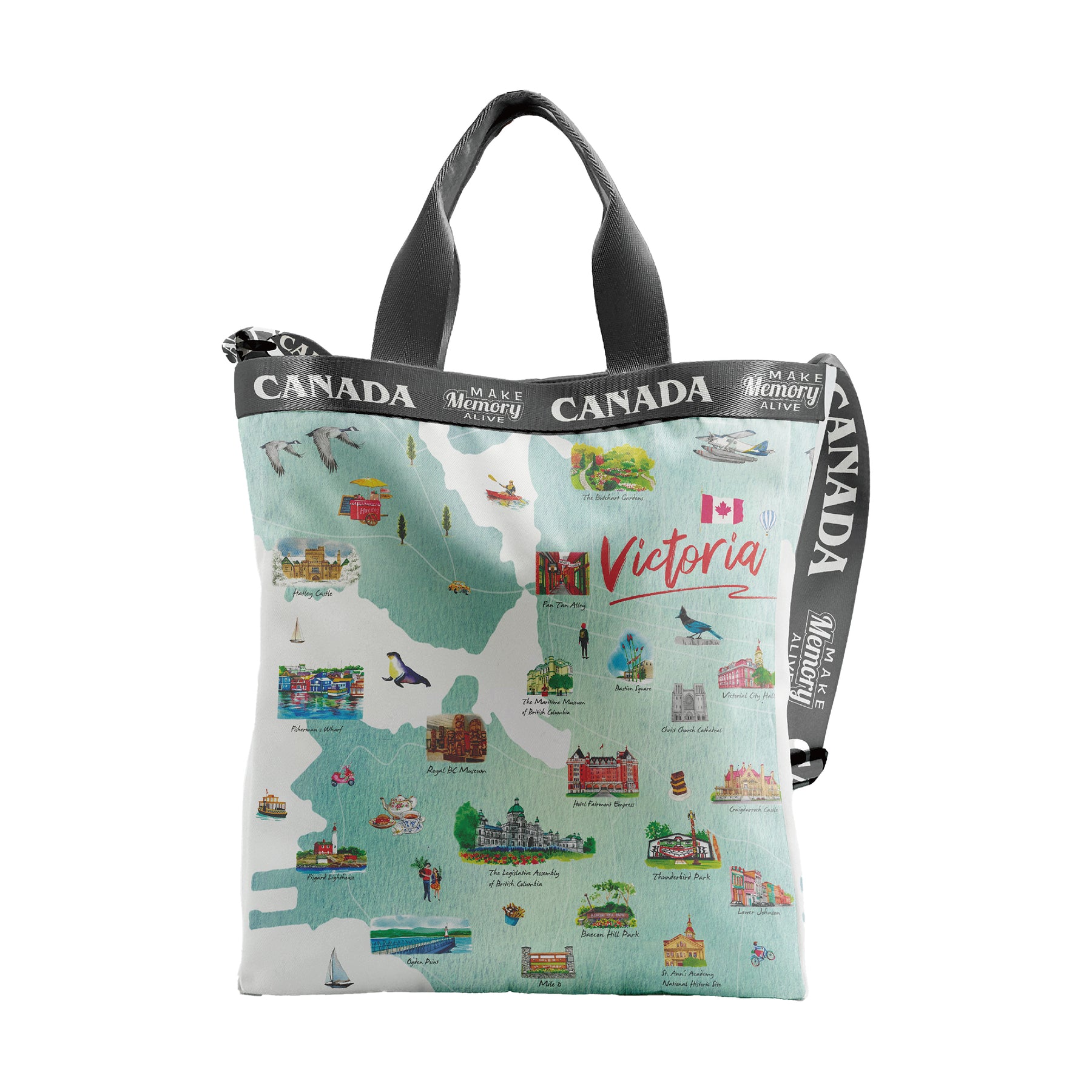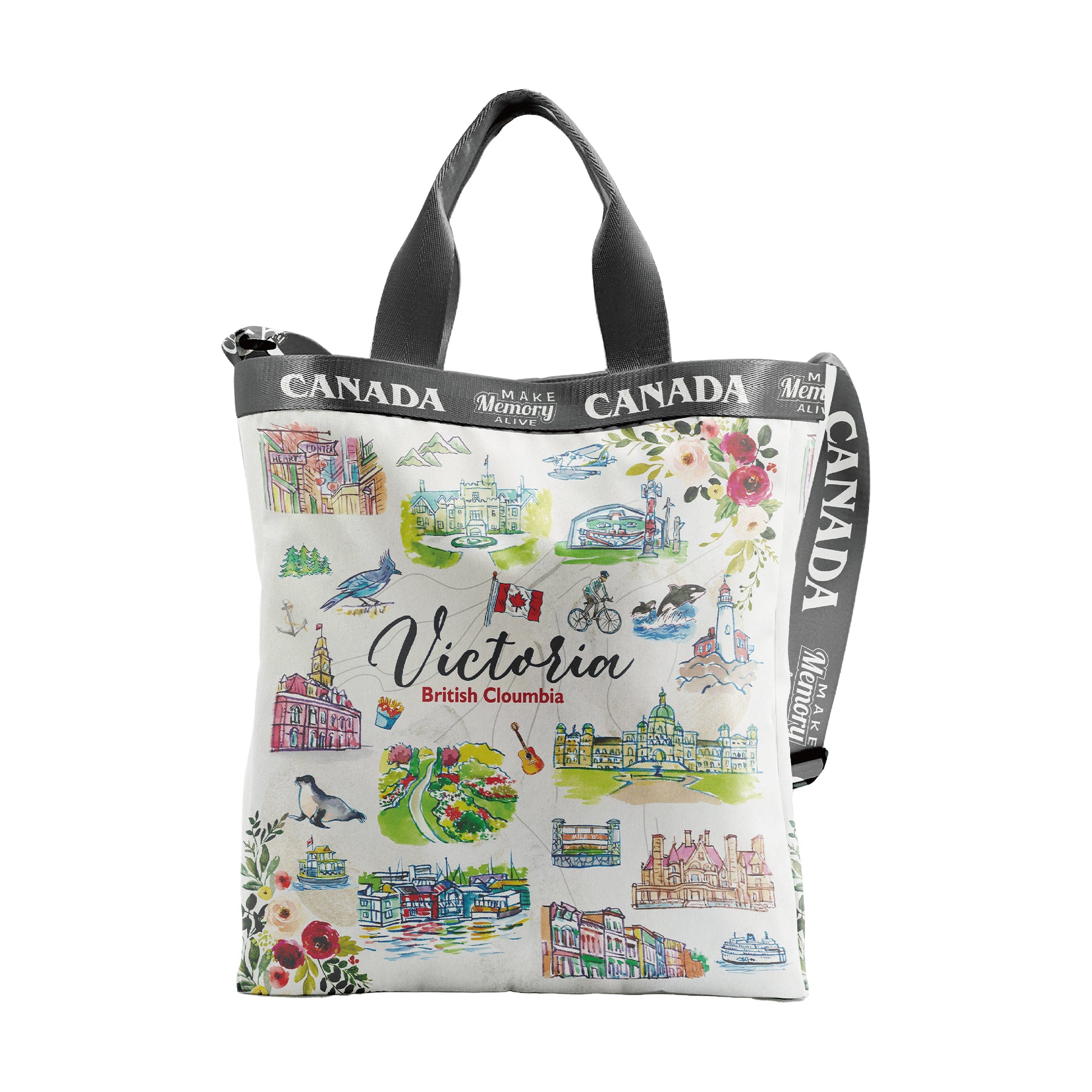This illustrated two-way sling bag celebrates Victoria with a lively collection of hand-drawn watercolor scenes featuring beloved city landmarks, floral details, coastal wildlife, heritage buildings, and local cultural elements. The artwork highlights iconic spots such as Fisherman’s Wharf, Beacon Hill Park, Craigdarroch Castle, Butchart Gardens, and the Parliament Buildings, arranged around the expressive “Victoria – British Columbia” lettering for a bright and inviting look.